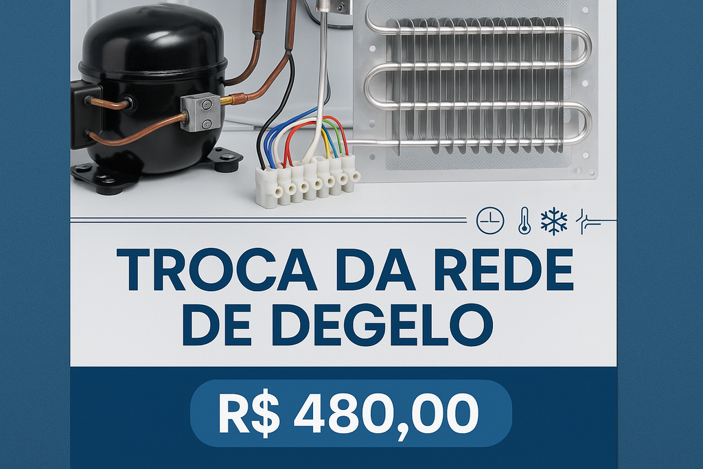Este serviço especializado inclui a substituição completa da rede de degelo, abrangendo sensores, resistor e bimetal. Com essa manutenção, seu sistema de refrigeração recupera a eficiência ideal no controle do degelo, prevenindo falhas e garantindo o funcionamento correto e seguro do aparelho. Ideal para preservar a durabilidade do equipamento e evitar danos causados pelo acúmulo de gelo. Valor: R$ 450,00.